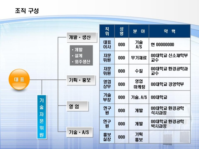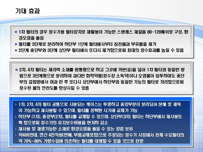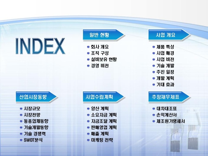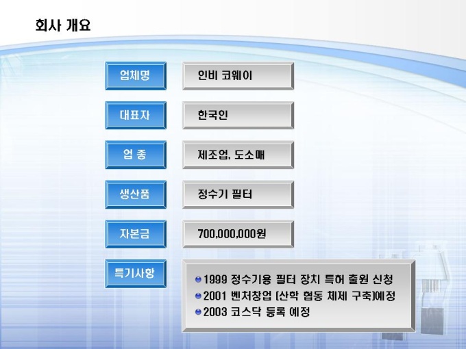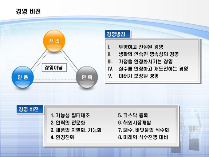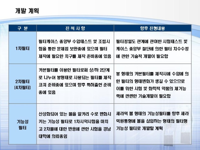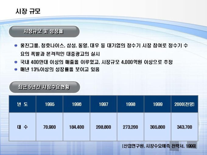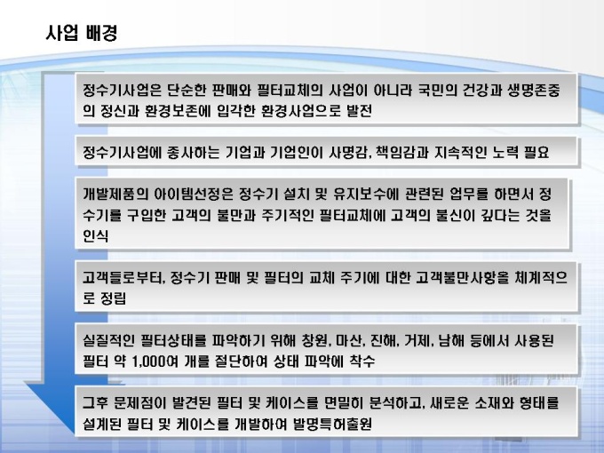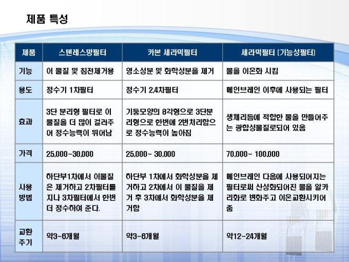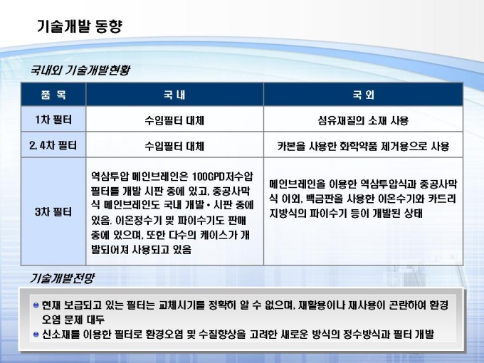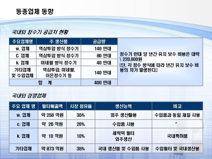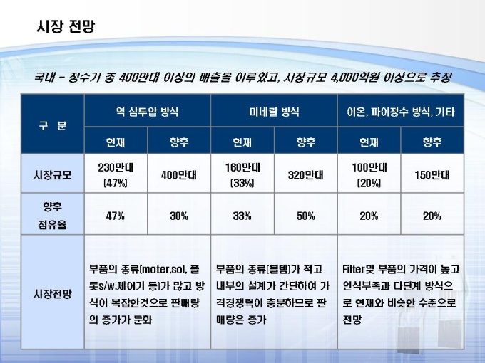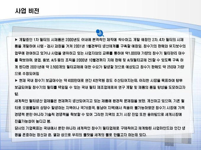 정수기필터 제조, 도소매업 사업계획서입니다. 목차는 1.일반현황 2.사업개요 3.산업시장동향 4.사업수립계획 5.추정재무제표로 구성되어있습니다.