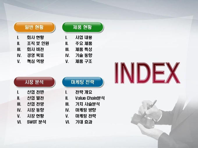 모바일컨텐츠 개발 전략수립 사업계획서입니다. 목차는 1.일반현황 2.제품현황 3.시장분석 4.마케팅 전략으로 구성되어있습니다.
