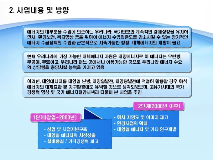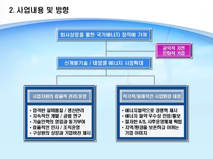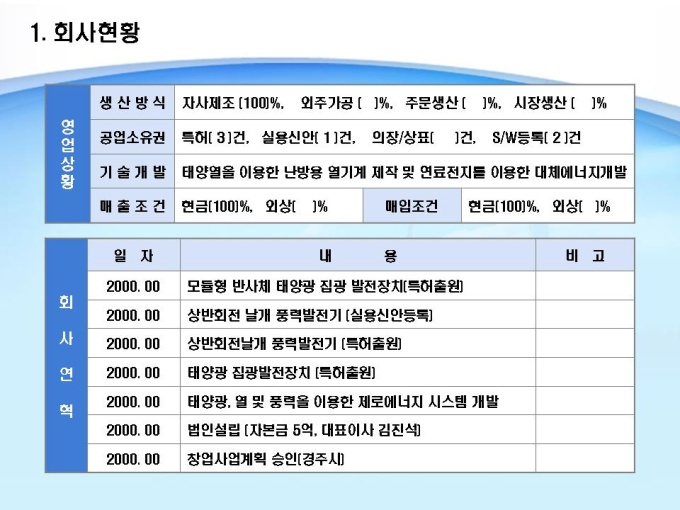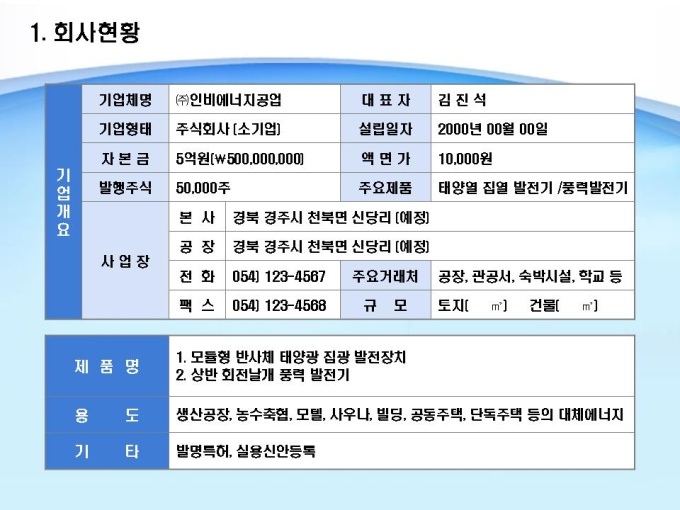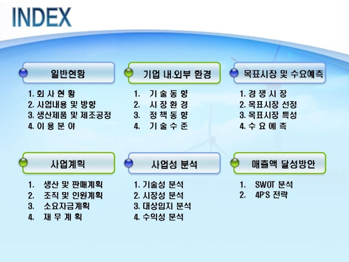 발전기 에너지 사업계획서입니다. 목차는 1.일반현황 2.기업 내.외부 환경 3.목표시장 및 수요예측 4.사업계획 5.사업성 분석 6.매출액 달성방안으로 구성되어있습니다.