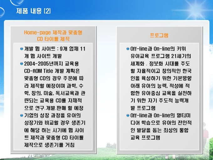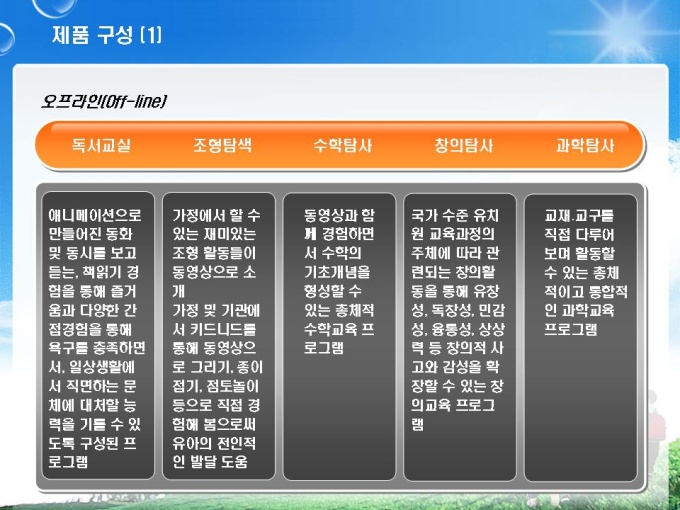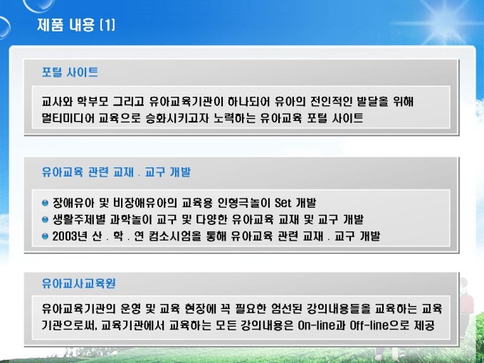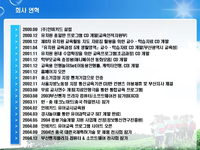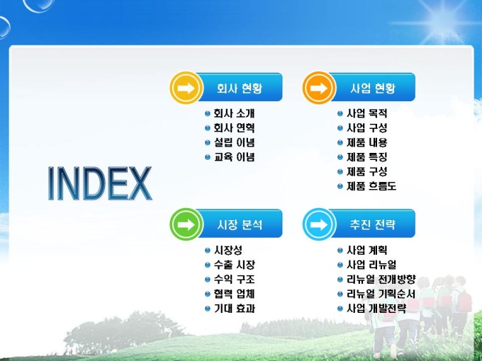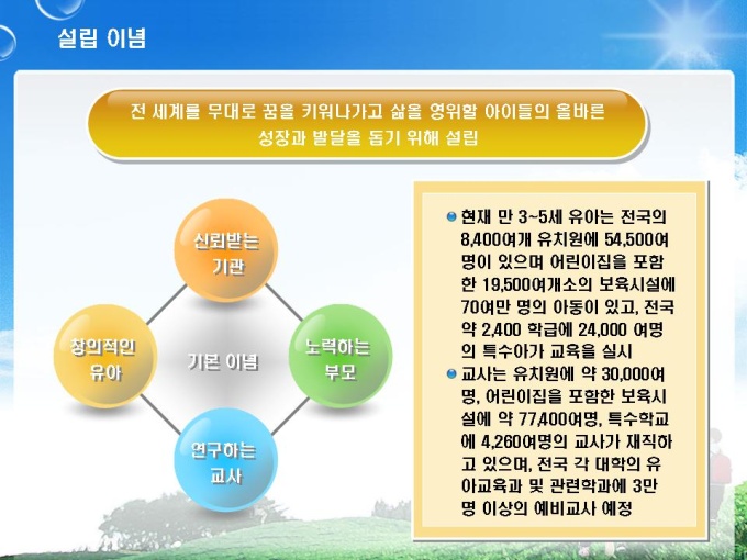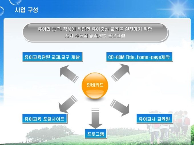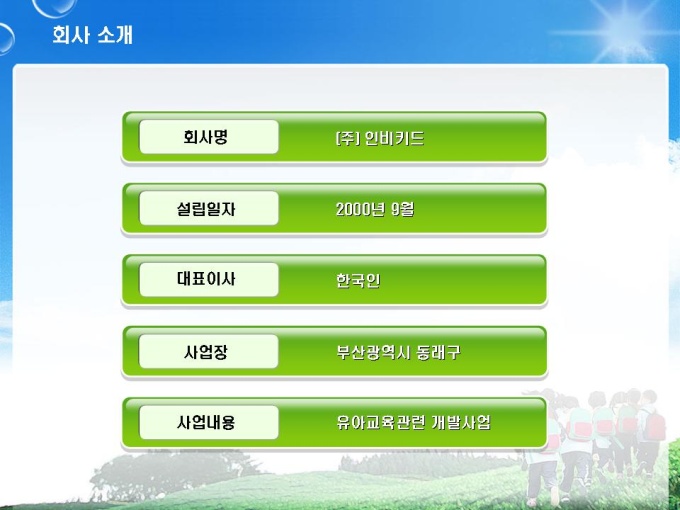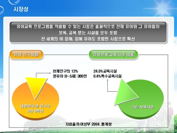 유아교육업 회사소개서, 사업계획서입니다. 목차는 1.회사현황 2.사업현황 3.시장분석 4.추진전략으로 구성되어있습니다.
