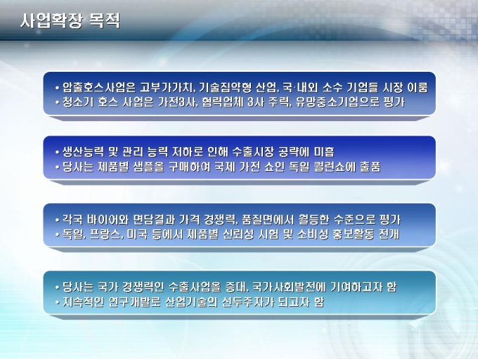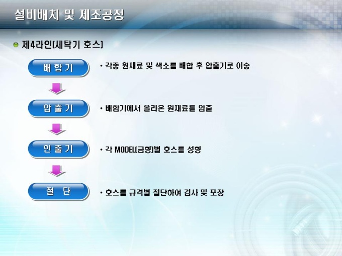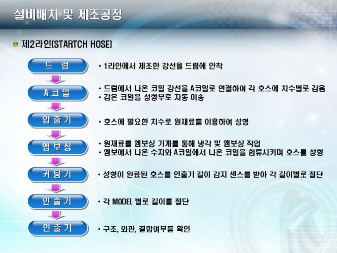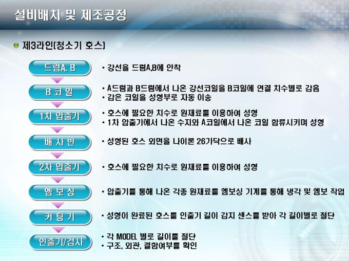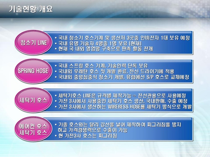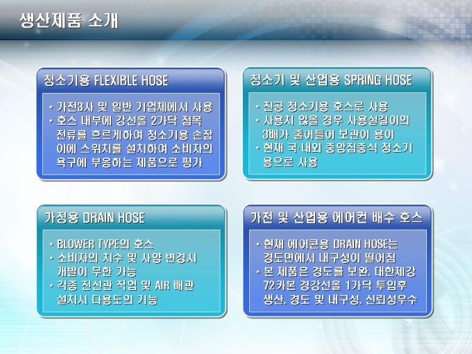 청소기, 가전용, 산업용 호스 제조업체의 사업계획서입니다. 목차는 1.사업개요 2.기술현황 3.경영 및 시설계획 4.매출 및 매입계획 5.추정 재무제표로 구성되어있습니다.