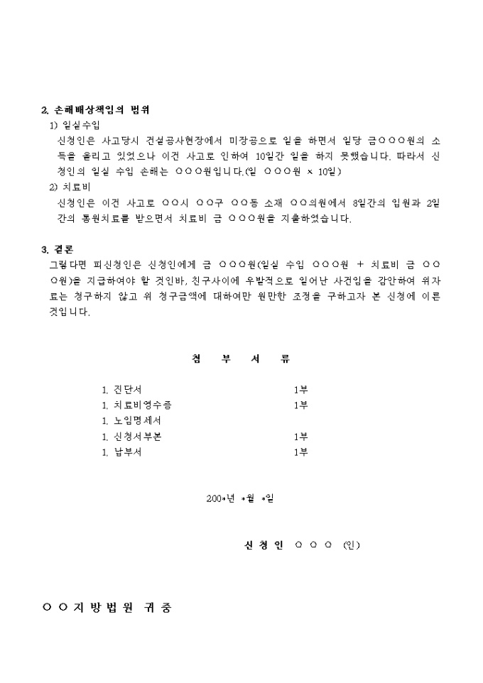 손해배상 관련 민사조정신청서 작성 예문입니다.