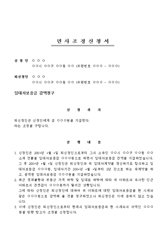 9,000원/월임대차보증금의 감액을 청구하는 내용의 민사조정신청서 작성 예문입니다.