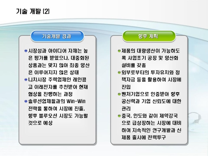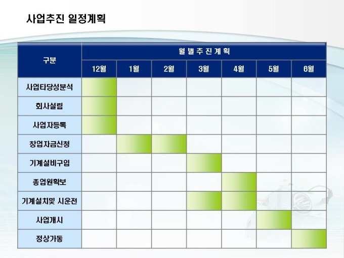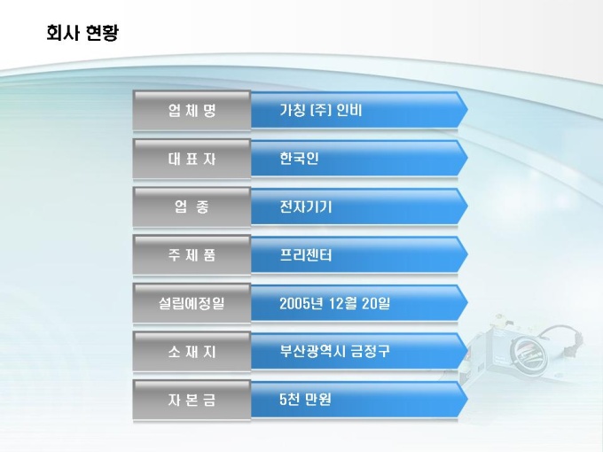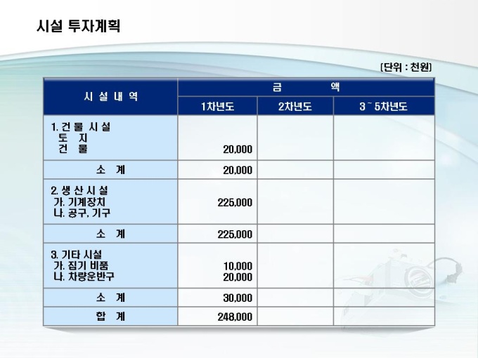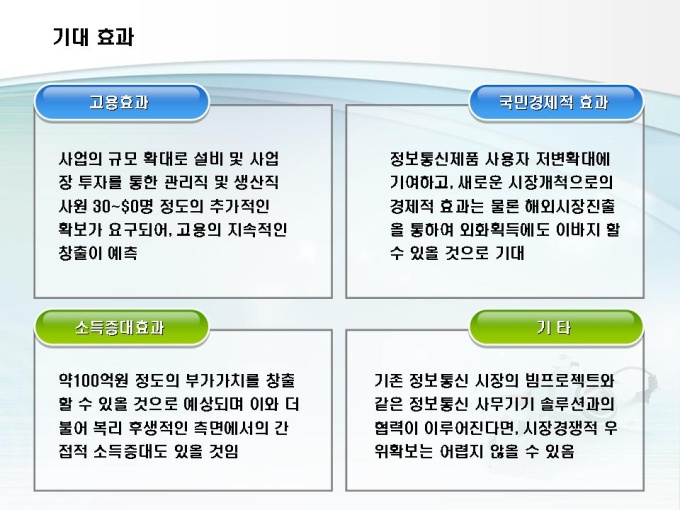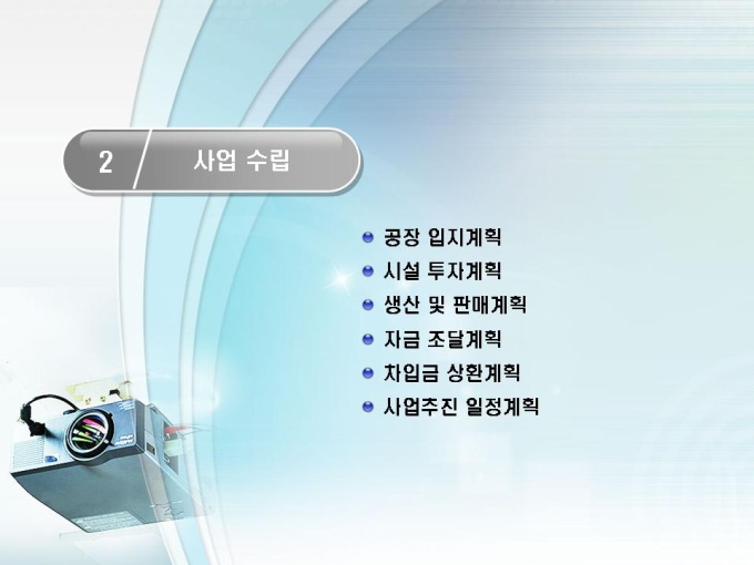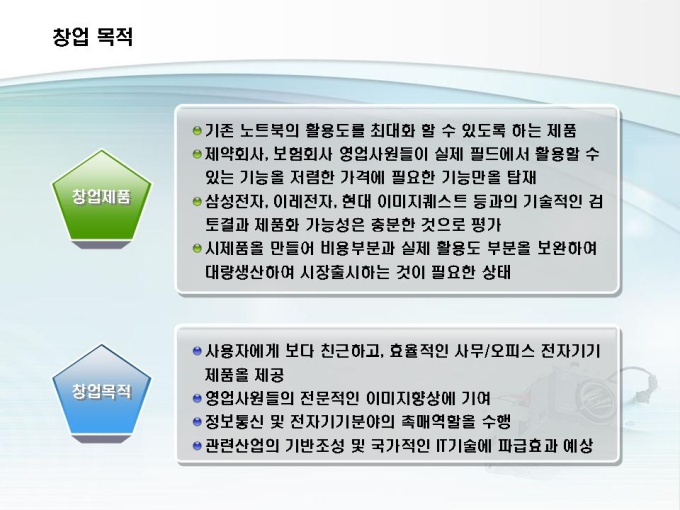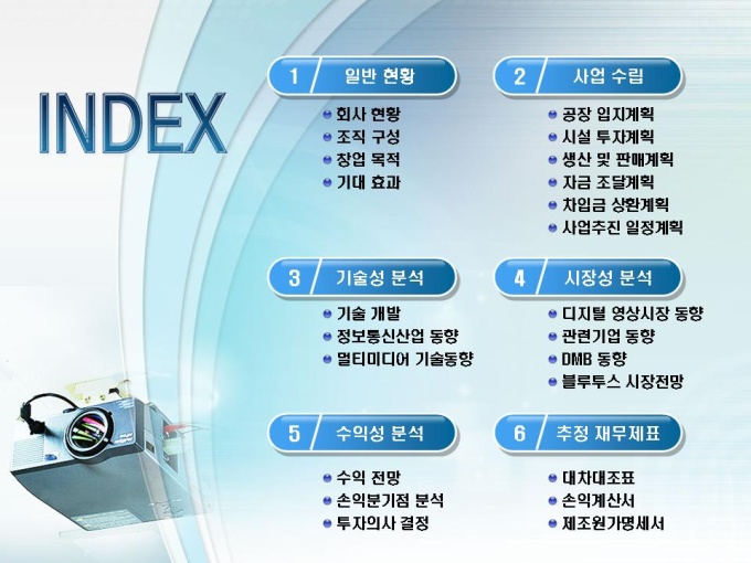 전자기기 제조 사업계획서로 창업시 추진방향에 대한 내용입니다. 목차는 1.일반현황 2.사업수립 3.기술성 분석 4.시장성 분석 5.수익성 분석 6.추정 재무제표로 구성되어있습니다.
