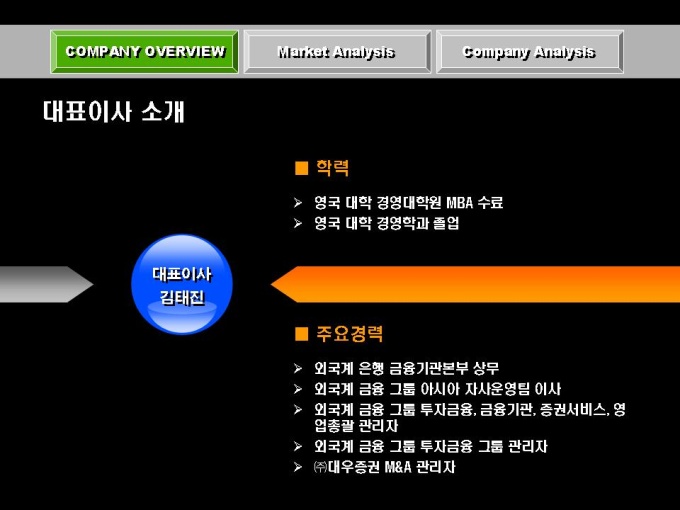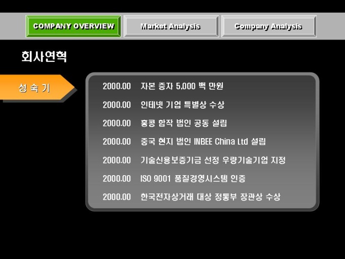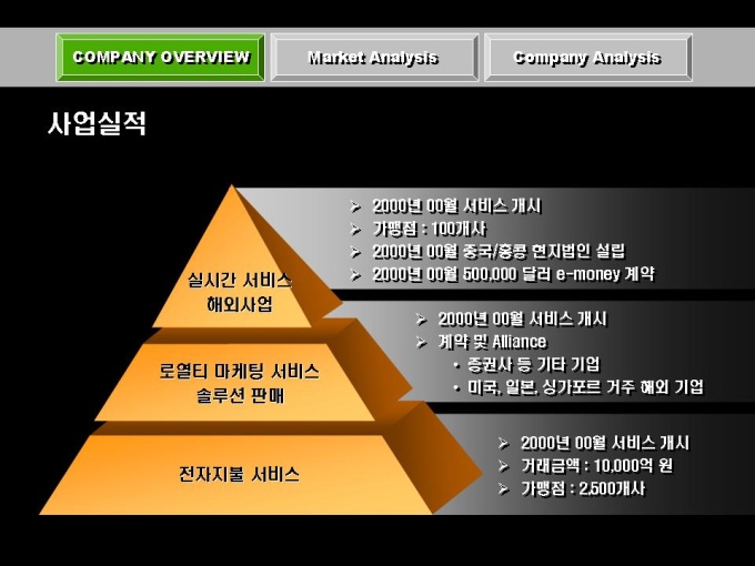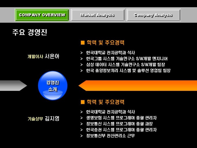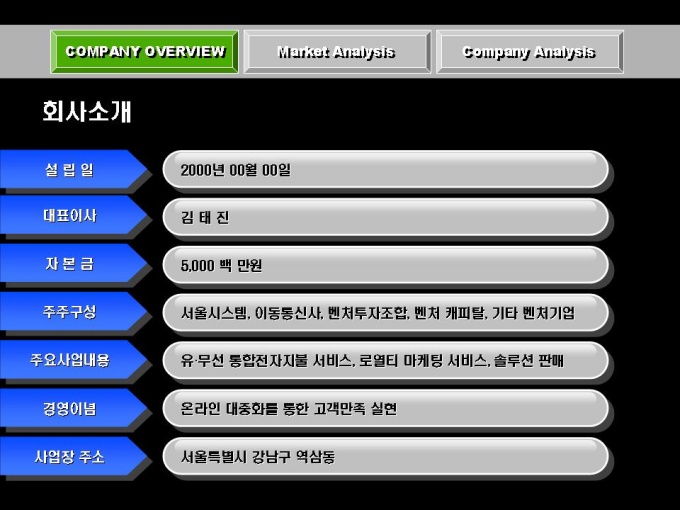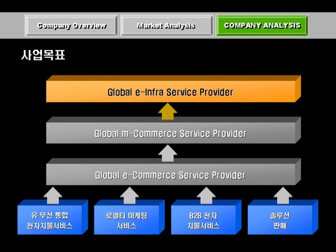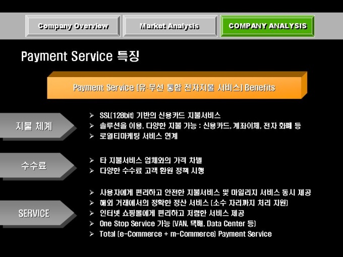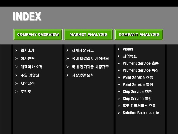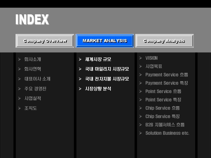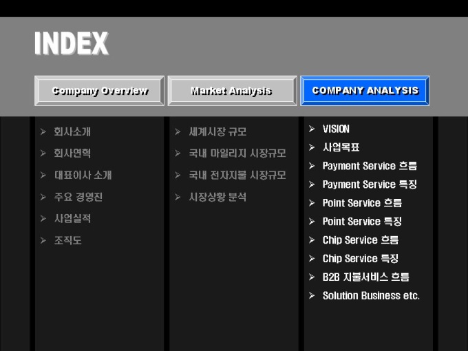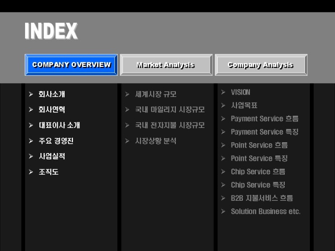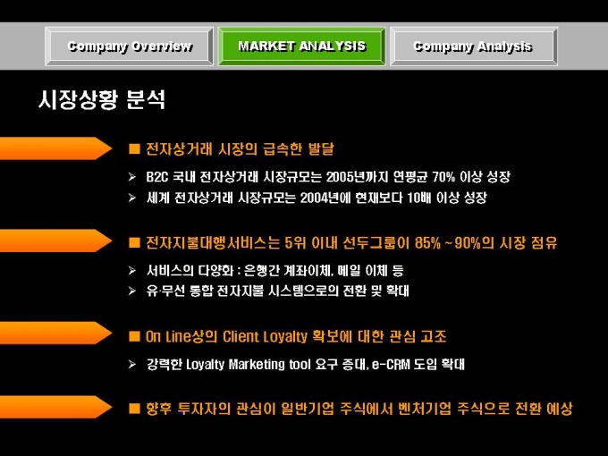 전자상거래, 솔루션 개발 사업 회사소개서입니다. 목차는 크게 COMPANY OVERVIEW(회사개요), MARKET ANALYSIS(마케팅 전략), COMPANY ANALYSIS(회사전략)로 구성되어있습니다.