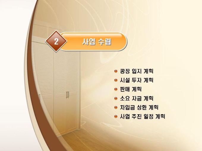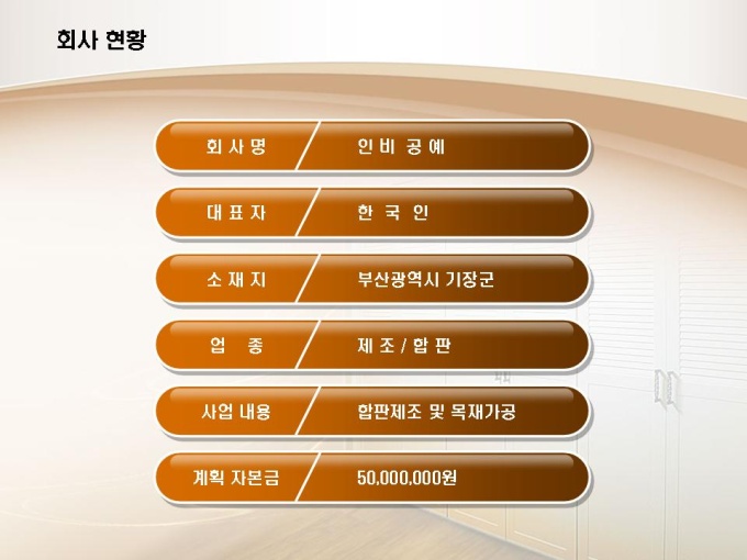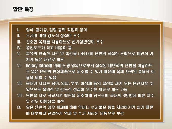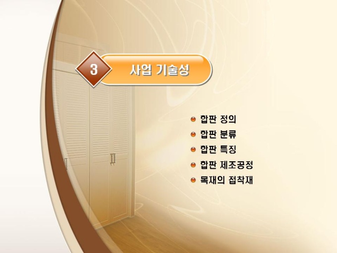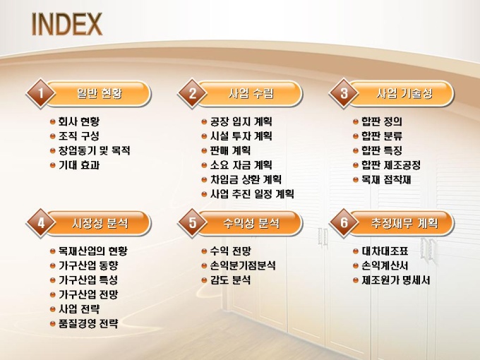 합판제조, 목재가공 사업계획서입니다. 목차는 1.일반현황 2.사업수립 3.사업 기술성 4.시장성 분석 5.수익성 분석 6.추정 재무계획으로 구성되어있습니다.