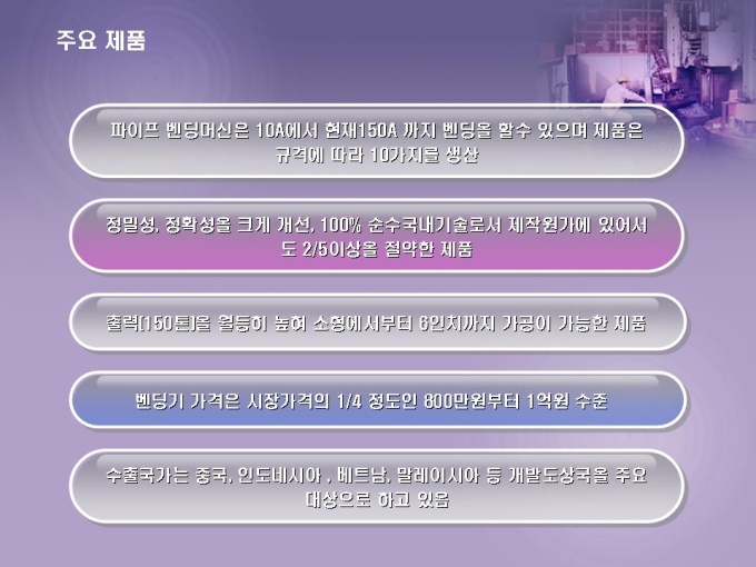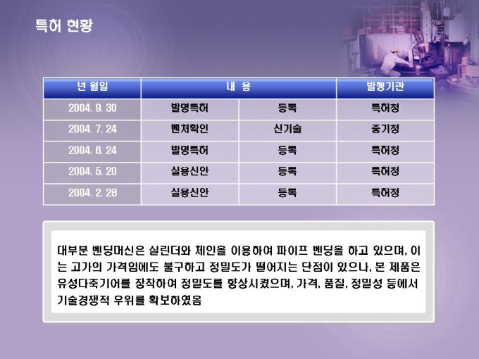 기계제작 벤처기업 사업계획서로 파이프 벤딩기 제조에 관한 내용입니다. 목차는 1.회사개요 2.사업내용 3.산업동향 4.사업 추진전략 5.사업 경제성 6.재무계획으로 구성되어있습니다.