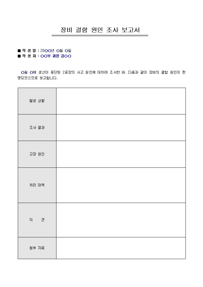 장비결함을 보고하는 표형식으로 되어 있는 내부사고 보고서입니다.