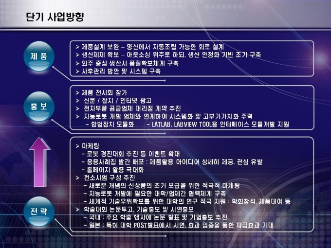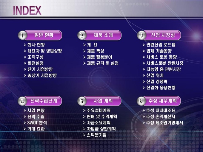 첨단기기 제조업체의 전략수립 사업계획서입니다. 목차는 1.일반현황 2.제품소개 3.산업 시장성 4.전략수립단계 5.사업계획 6.추정 재무계획으로 구성되어있습니다.