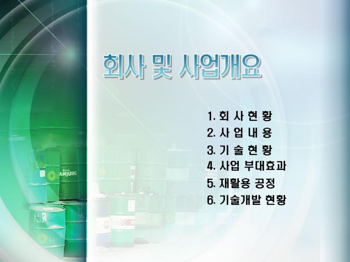 폐플라스틱 재활용 사업계획서입니다. 목차는 크게 회사 및 사업개요, 부문별 사업계획으로 구성되어있습니다.