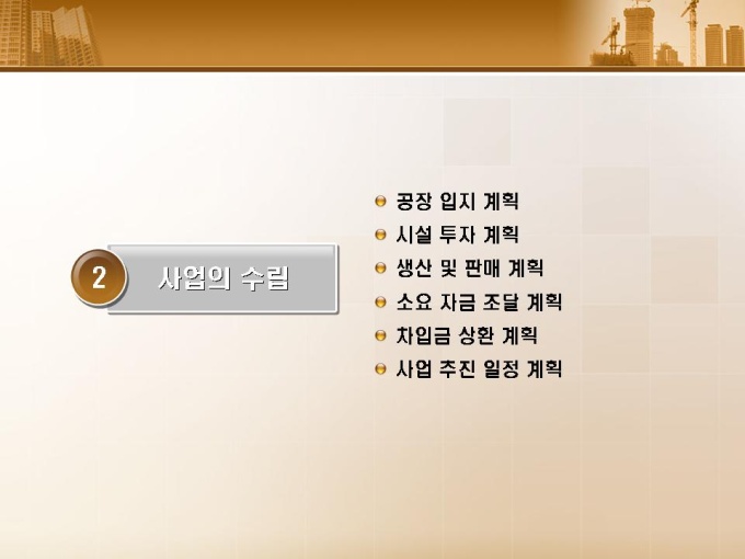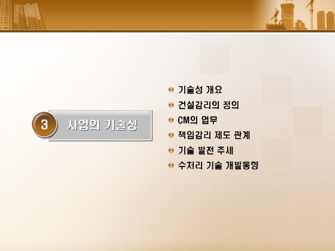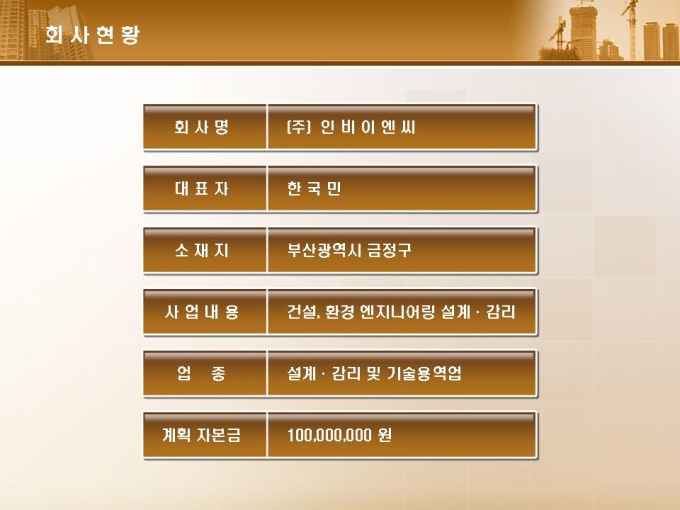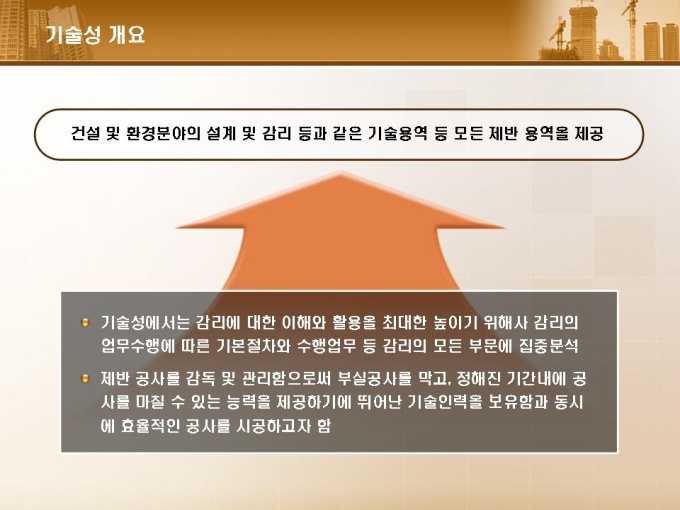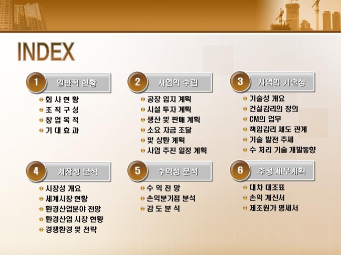 건설 환경 관련 엔지니어링 설계와 감리 사업계획서입니다. 목차는 1.일반적 현황 2.사업의 수립 3.사업의 기술성 4.시장성 분석 5.수익성 분석 6.추정재무계획으로 구성되어있습니다.
