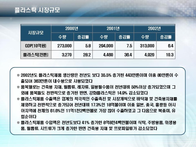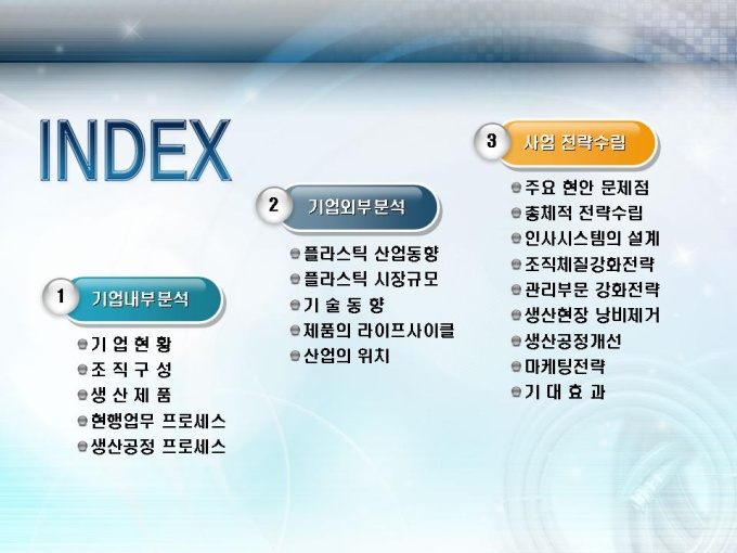 플라스틱 제조업 전략수립 사업계획서입니다. 목차는 크게 1.기업 내부분석 2.기업 외부분석 3.사업 전략수립으로 구성되어있습니다.