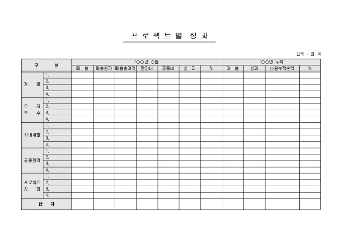 기간별 손익, 매출현황 등의 기록으로 결산 보고 시 사용할 수 있는 결산보고서입니다. 매출현황, 판매비와 일반관리비, 프로젝트별 성과 등의 항목으로 구성되어있습니다.