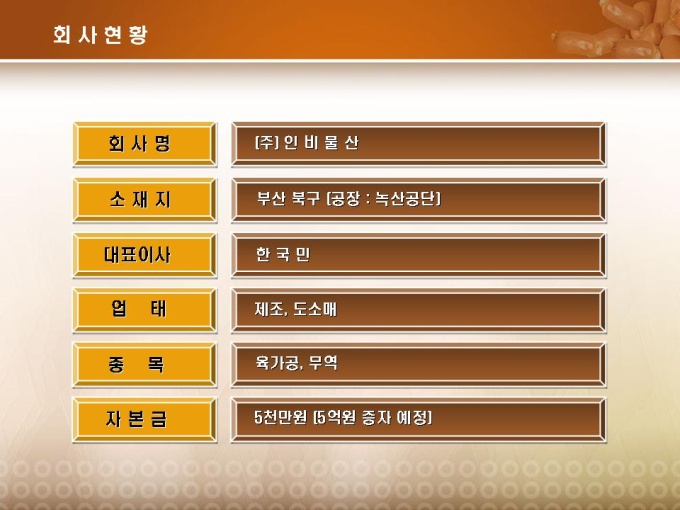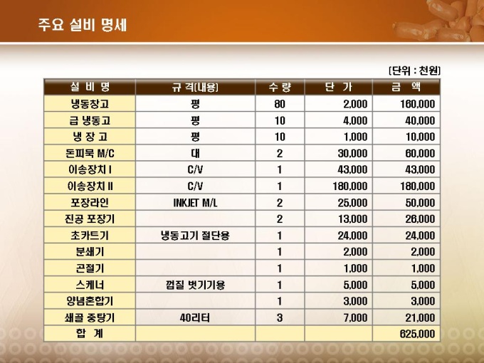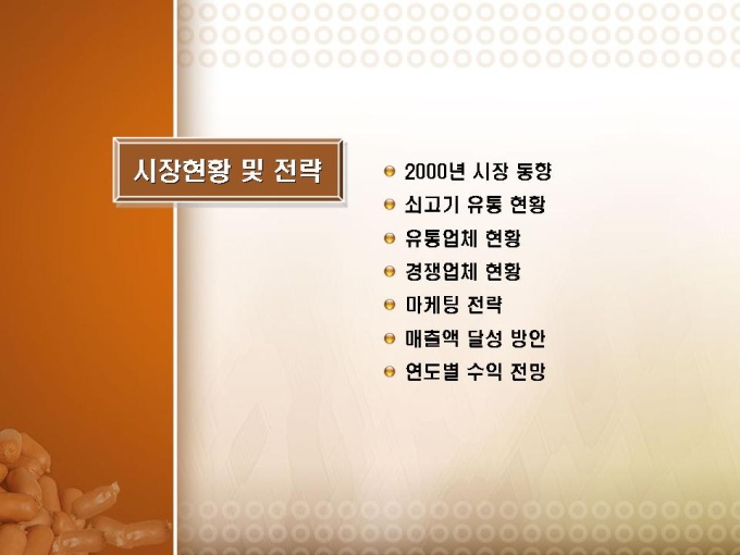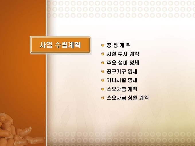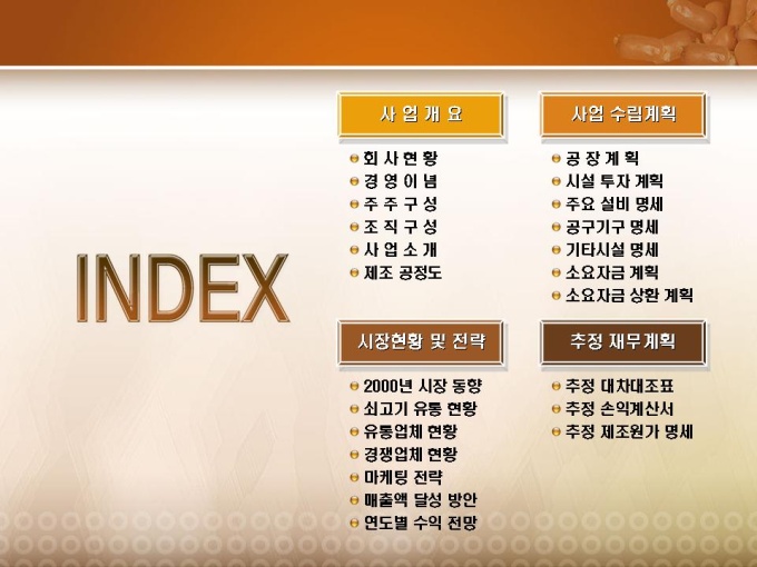 식육제품 가공, 무역 사업계획서입니다. 목차는 1.사업개요 2.사업 수립계획 3.시장현황 및 전략 4.추정 재무계획으로 구성되어있습니다.