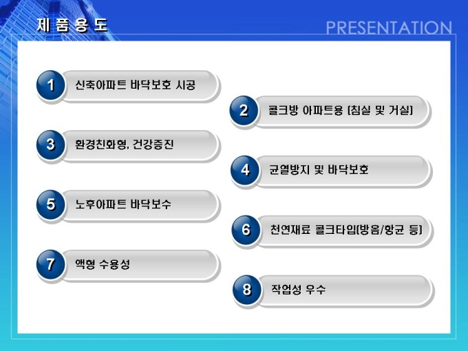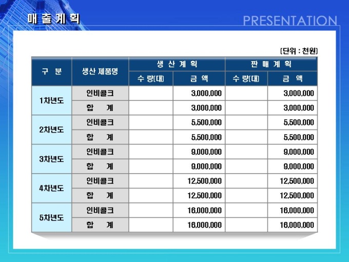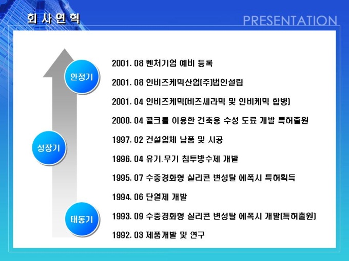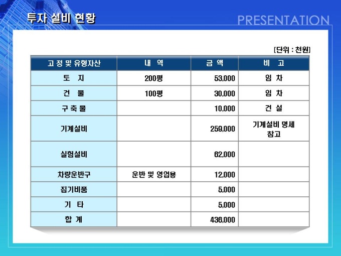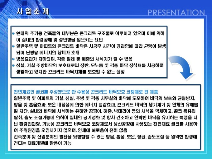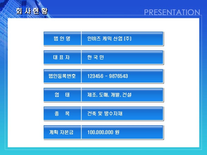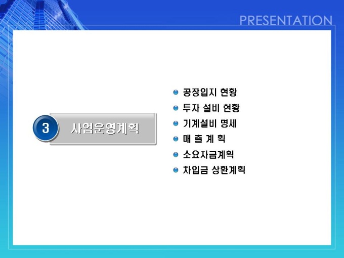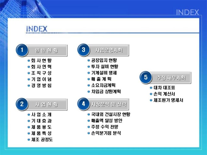 건축, 방수자재 회사의 사업계획서입니다. 목차는 1.일반현황 2.사업현황 3.사업운영계획 4.시장분석 및 전략 5.추정 재무계획입니다.