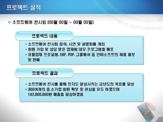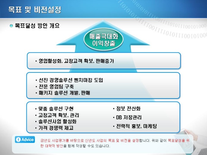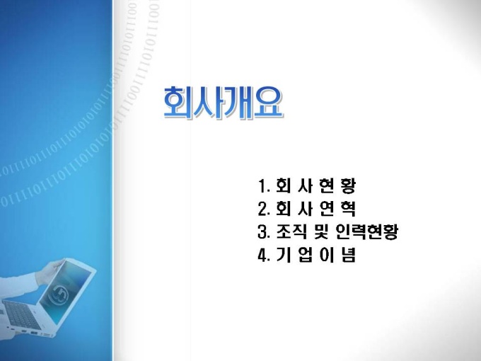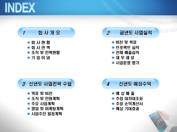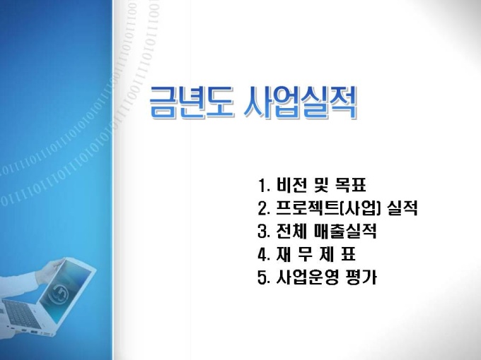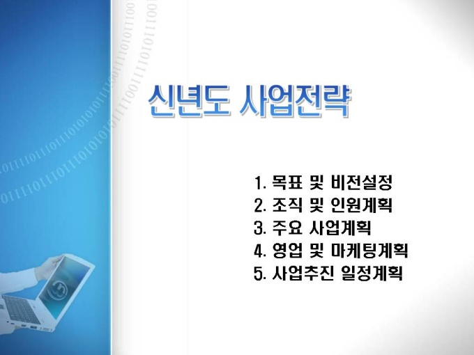 신년도 목표가 매출증대인 소프트웨어 업체의 신년도 사업계획서입니다. 목차는 1.회사개요 2.금년도 사업실적 3.신년도 사업전략 수립 4.신년도 예상수익으로 구성되어있습니다.