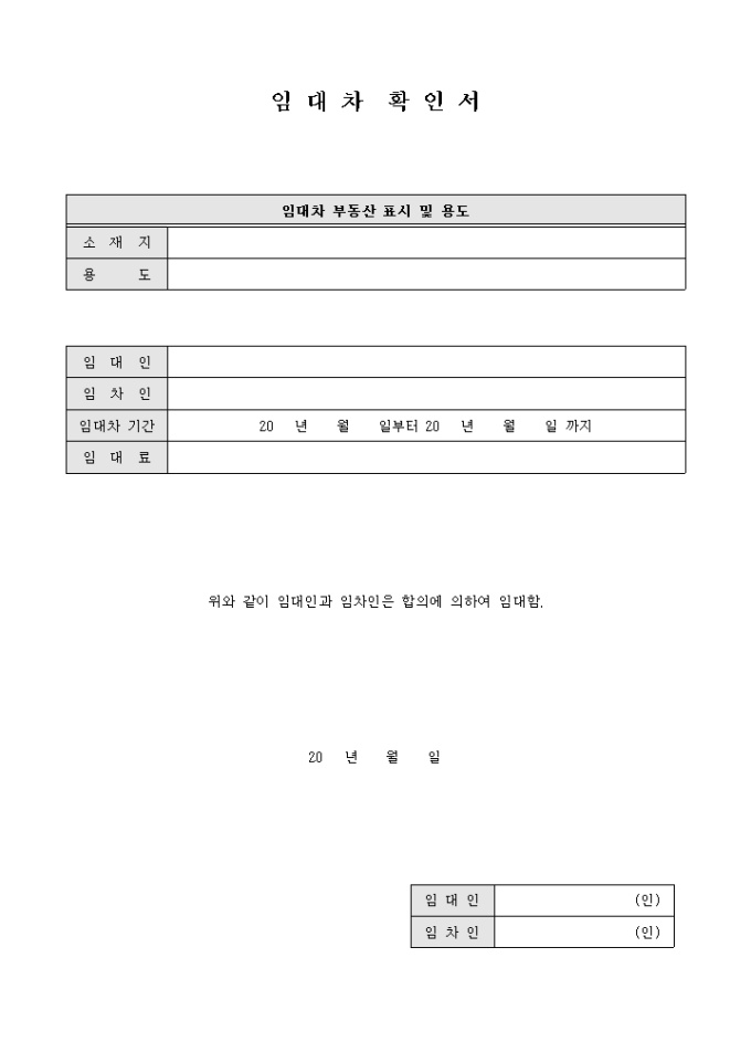 9,000원/월임대인과 임차인은 합의에 의하여 임대한다는 내용의 임대차 확인서입니다. 임대차 부동산 표시 및 용도, 임대차 기간, 임대료 등의 항목으로 구성되어있습니다.