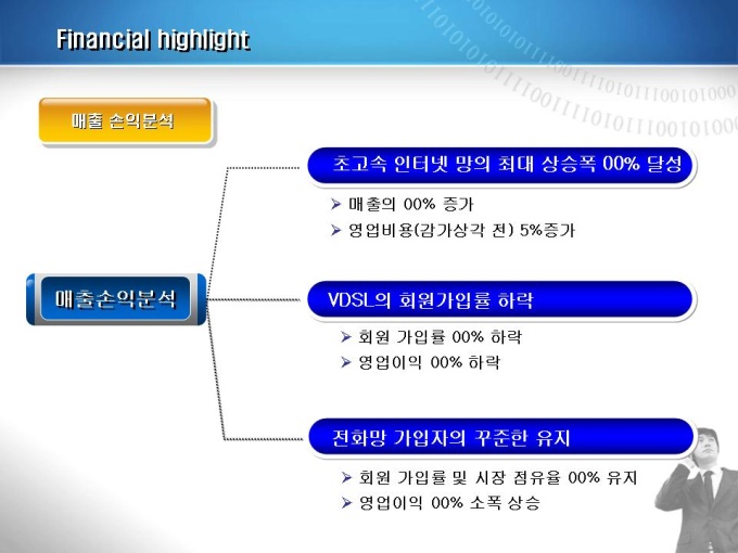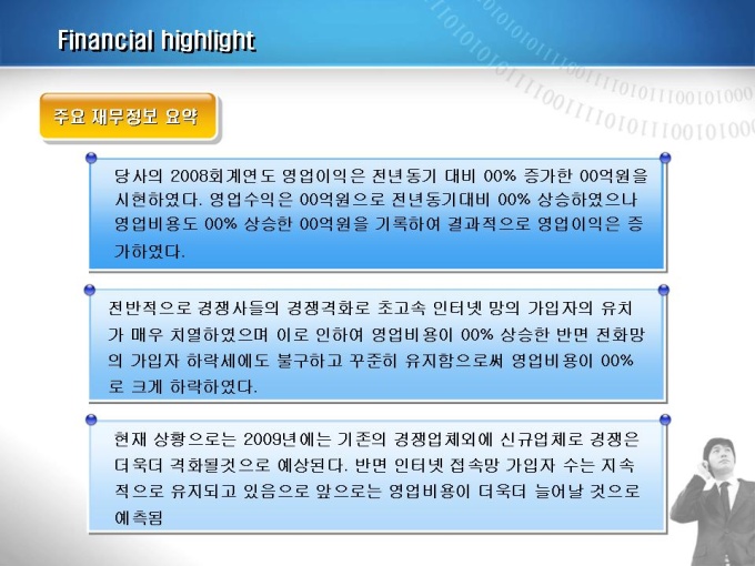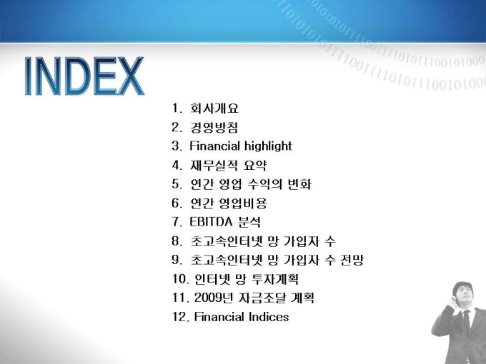 통신업체의 인터넷 관련 영업실적 보고서입니다. 내용은 회사개요, 경영방침, 재무실적, 연간 영업수익 등으로 구성되어있습니다.