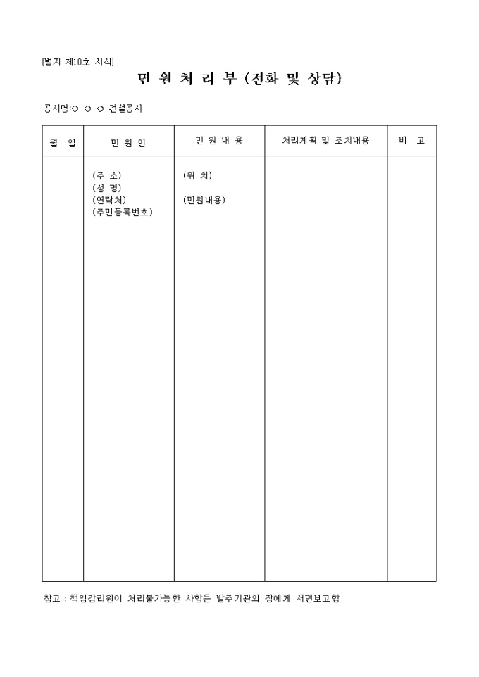 월일,민원인,민원내용,처리계획 및 조치내용,비고의 항목으로 구성된 양식입니다.