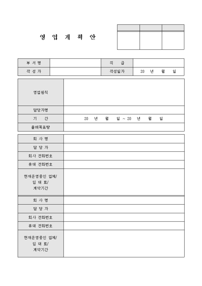 9,000원/월자판기 설치 등 물품임대사업과 관련한 영업계획을 수립할 수 있는 영업계획안입니다. 영업원칙, 담당자명, 기간, 올해목표량 등의 항목으로 구성되어있습니다.
