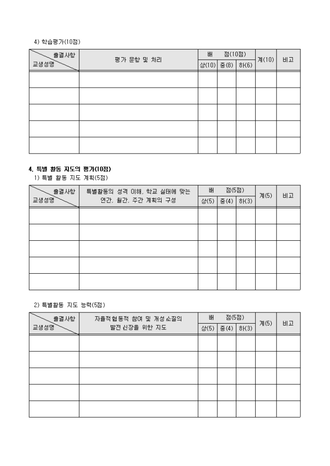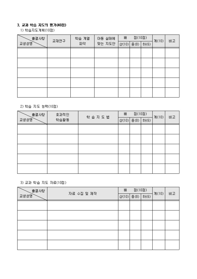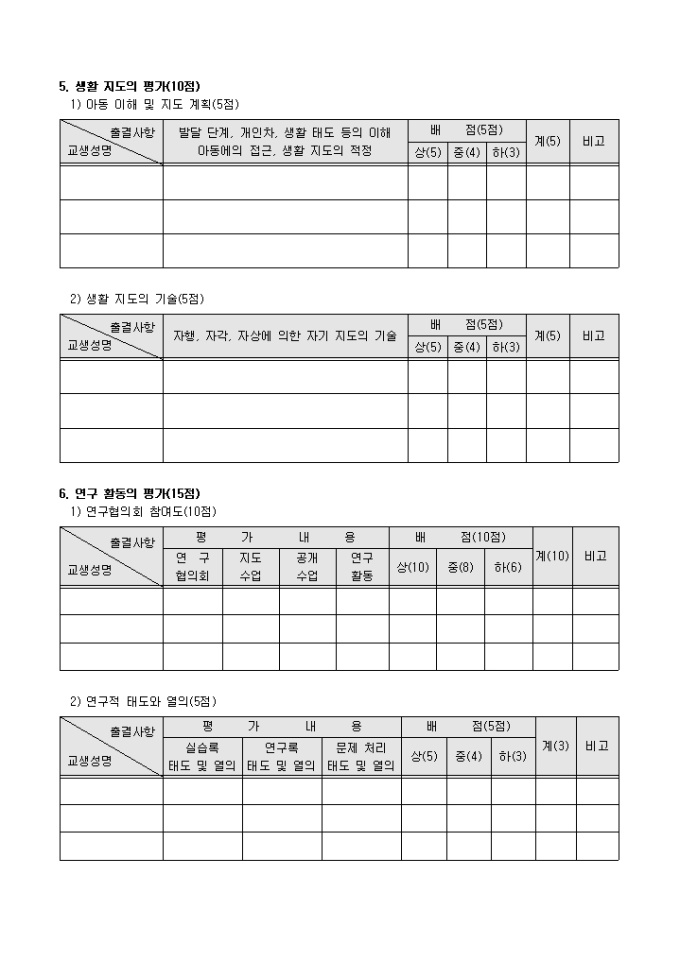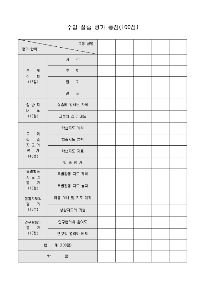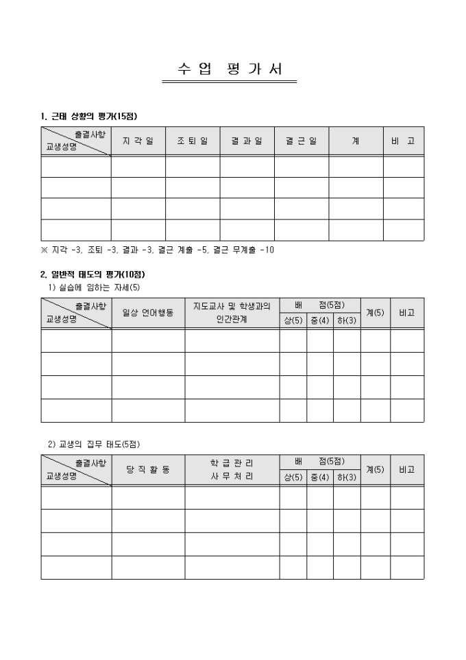 9,000원/월학교 교생들의 수업에 대한 평가 시 사용할 수 있는 수업평가서입니다. 근태상황의 평가, 일반적 태도의 평가, 교과 학습 지도의 평가 등으로 구성되어있습니다.