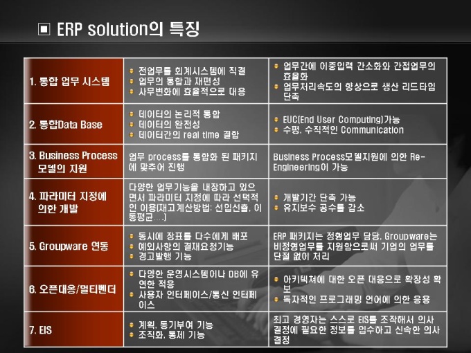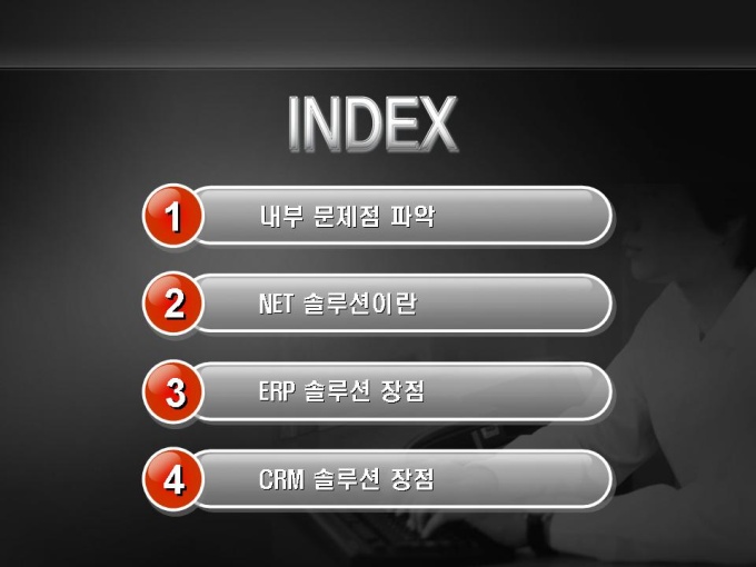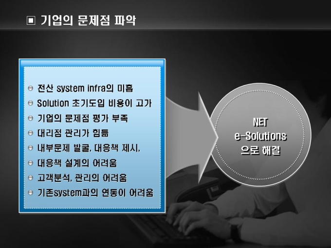 소프트웨어 제품 소개서입니다. 목차는 1.내부 문제점 파악 2.NET 솔루션이란 3.ERP 솔루션 장점 4.CRM 솔루션 장점으로 구성되어있습니다.