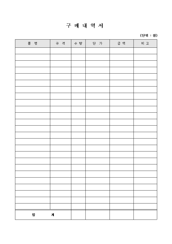 9,000원/월물품을 구매하였을때 작성하는 표형식의 구매내역서 양식입니다.