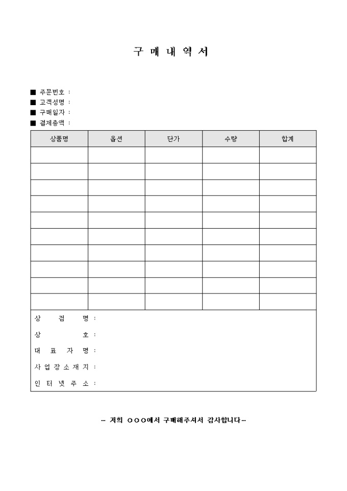 소비자가 구매한 내역을 상세한 항목으로 작성하여 보내주는 구매내역서 양식입니다.
