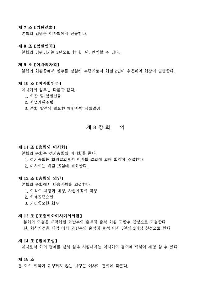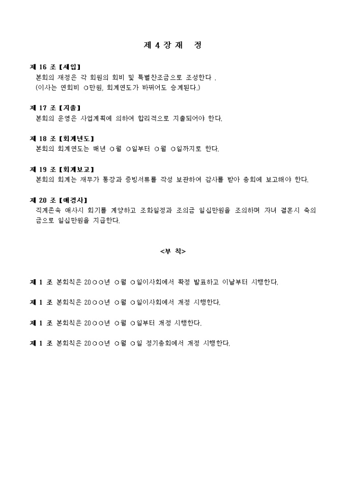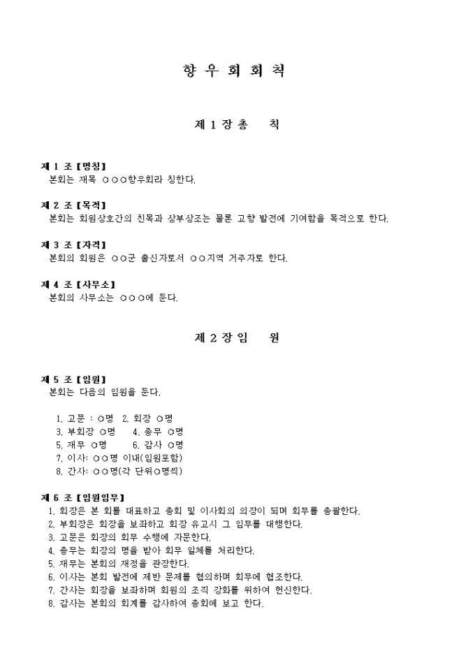 9,000원/월총칙, 임원, 회의, 재정등의 조항으로 구성된 향우회 회칙서식입니다.