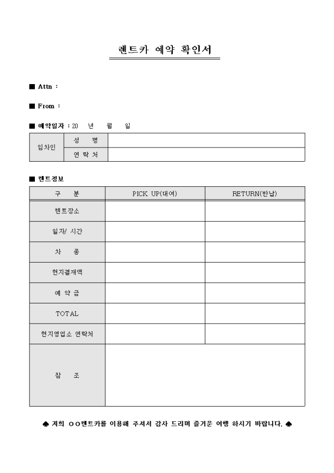 렌트카 예약을 확인 및 증명한다는 렌트카 예약 확인서입니다. 예약일자, 렌트정보 등의 항목으로 구성되어있습니다.
