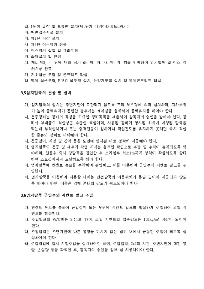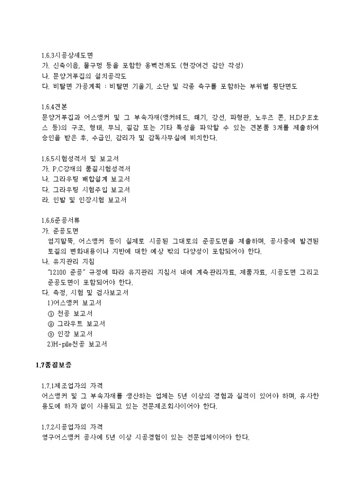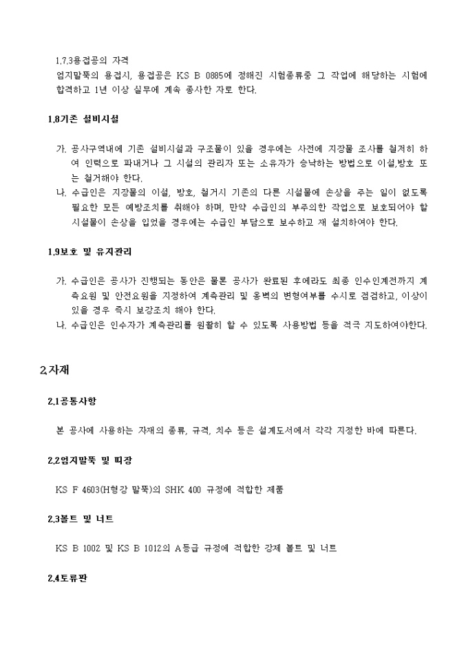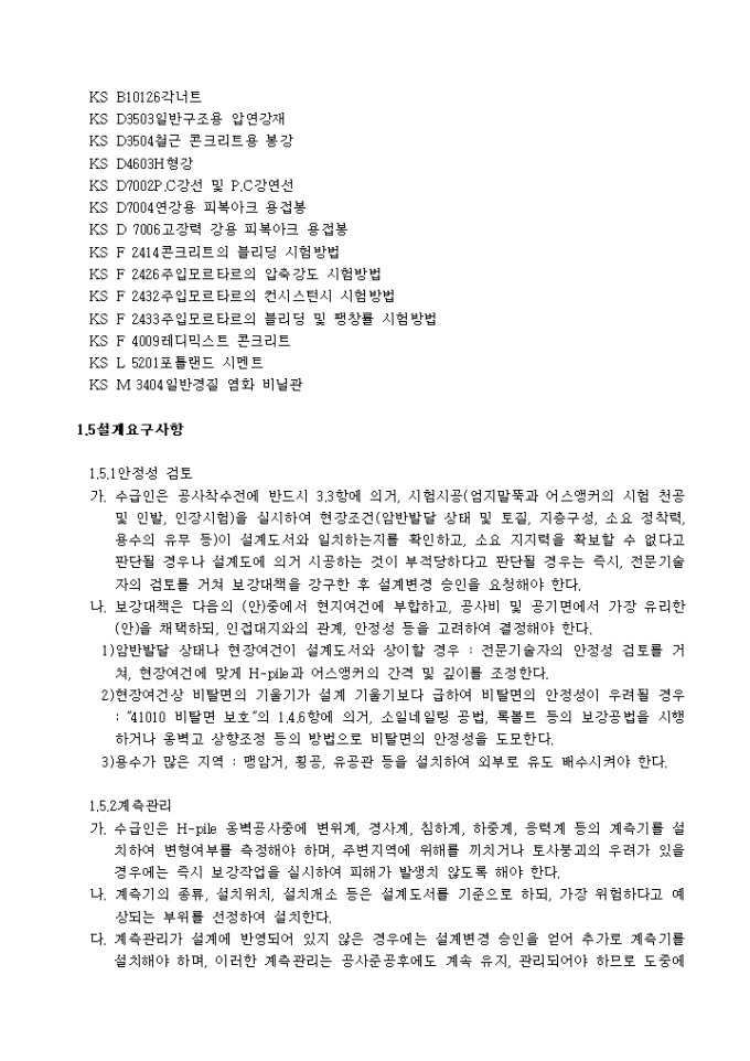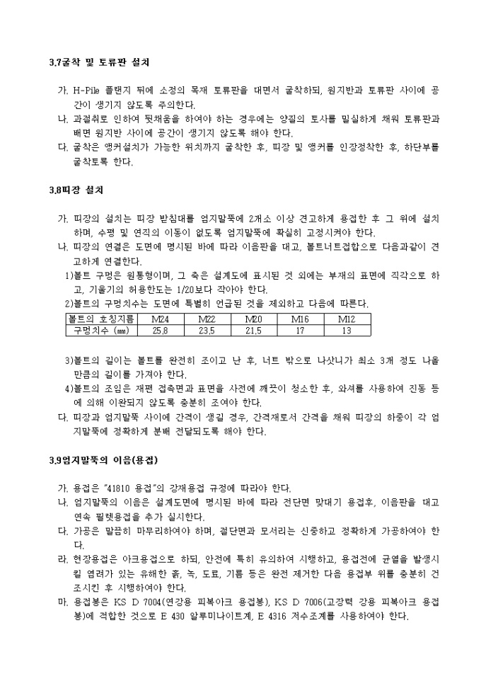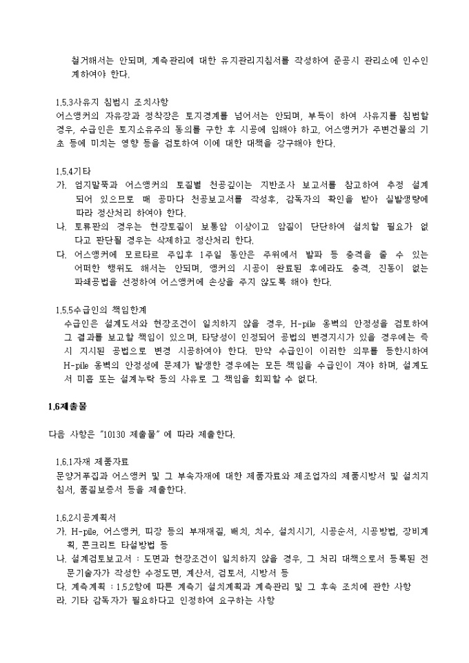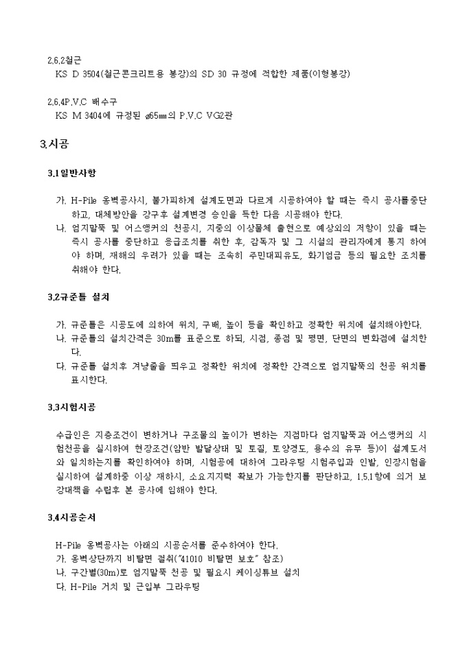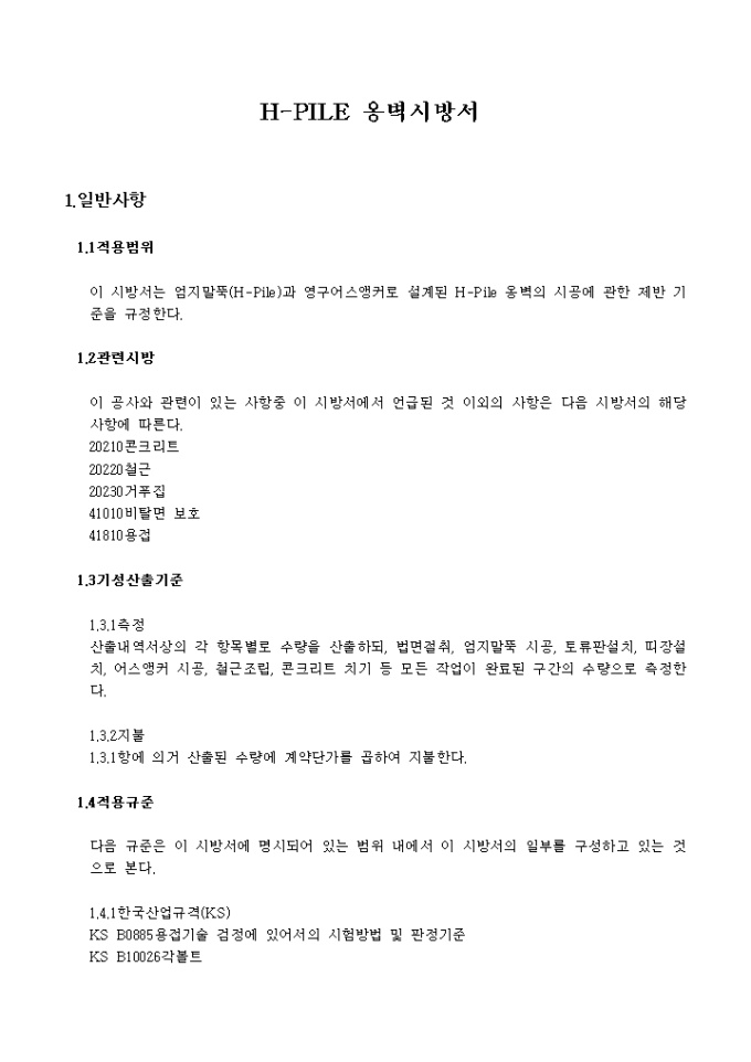 아래 항목으로 이루어진 H-PILE옹벽시방서입니다. 1.일반사항, 2.자재, 3.시공