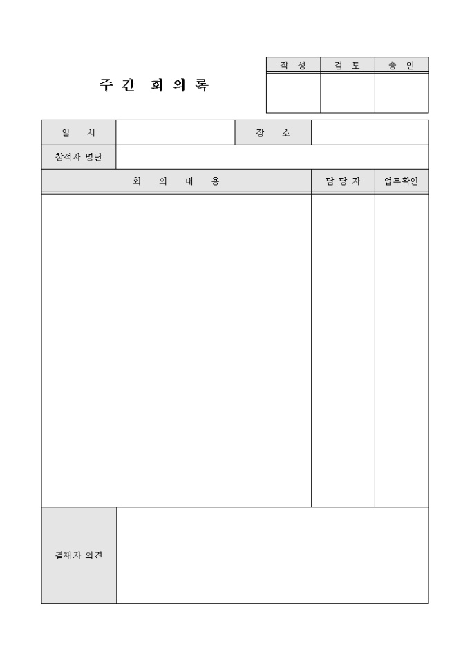 9,000원/월주간 회의 내용을 기록/ 관리할 수 있는 일반적인 양식의 주간 회의록입니다. 일시, 참석자 명단, 회의내용, 담당자 등의 항목으로 구성되어있습니다.