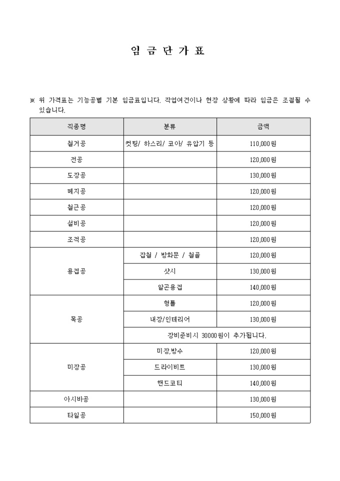 9,000원/월직종별 임금의 단가를 표형태로 작성하는 임금(노동)단가표입니다.
