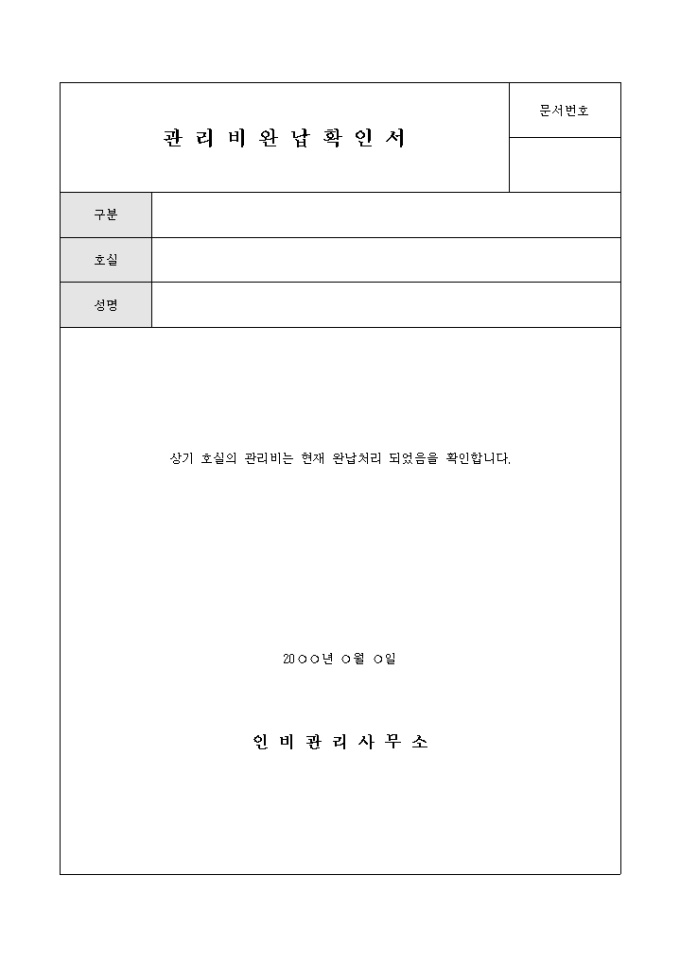 9,000원/월관리비를 완납했음을 확인해줄때 사용하는 완납확인서 양식입니다.