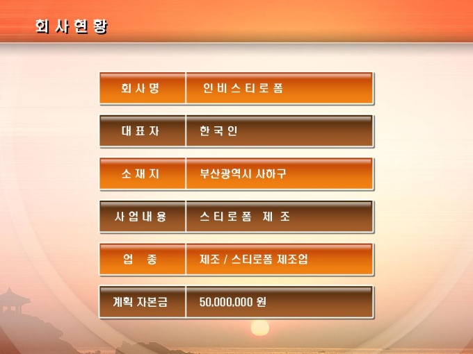 스티로폼 제조업체의 사업계획서입니다. 목차는 1.일반적 현황 2.제품분석 3.시장성 분석 4.사업 추진전략 5.수익성 분석 6.사업의 수립 7.추정 재무제표로 구성되어있습니다.