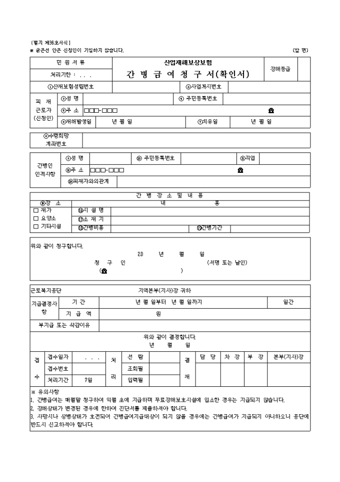 산업재해보상보험의 간병급여청구서 서식입니다.