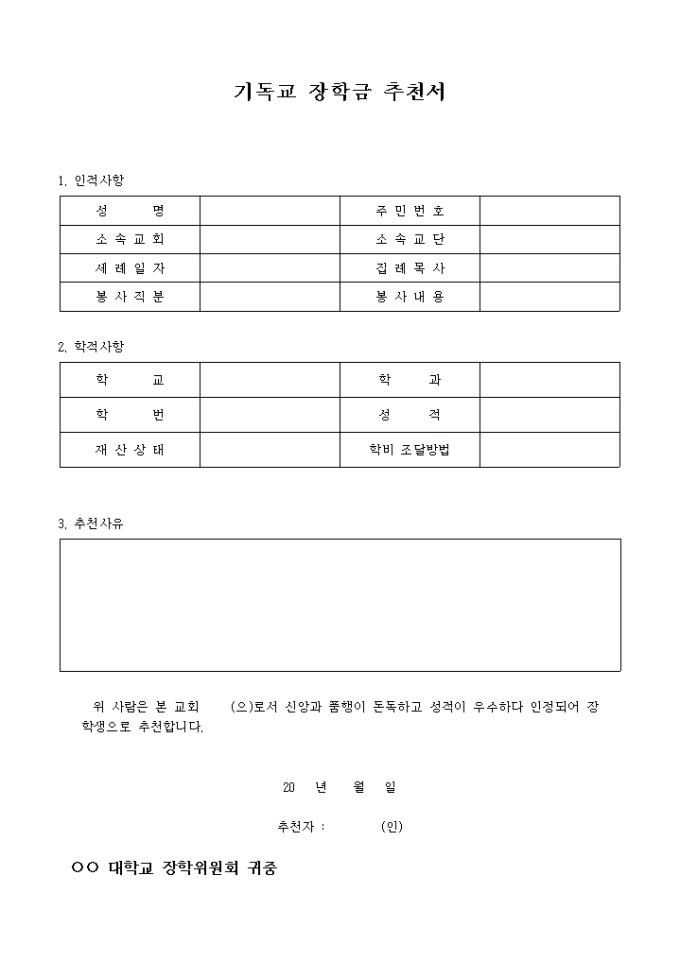 9,000원/월다니는 교회에서 학교에 장학금 대상을 추천할 때 사용하는 서식으로써 인적사항, 학적사항, 추천사유등으로 구성되어 있습니다.
