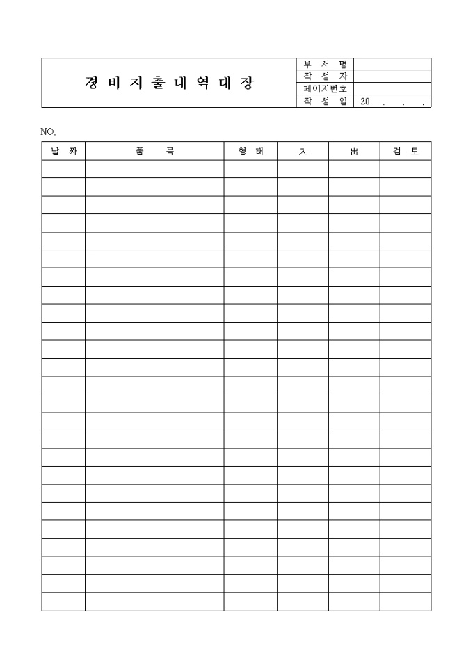 9,000원/월경비 지출 내역을 기록하는 경비 지출 내역 대장 양식입니다. 날짜, 품목, 형태, 입금, 출금, 검토 등의 항목으로 구성되어 있습니다.