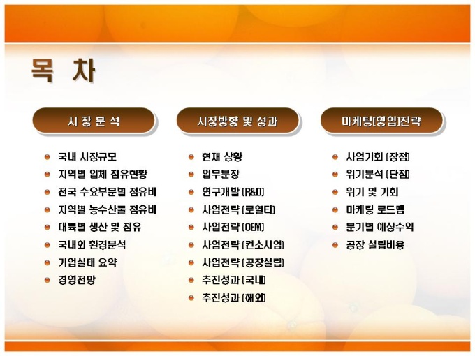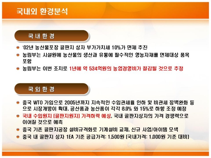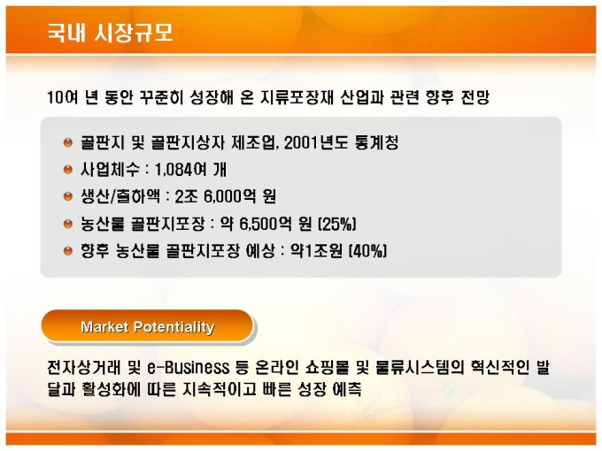 포장상자 기술개발 마케팅 전략기획 사업계획서입니다. 목차는 크게 1.시장분석 2.시장방향 및 성과 3.마케팅(영업)전략으로 구성되어있습니다.
