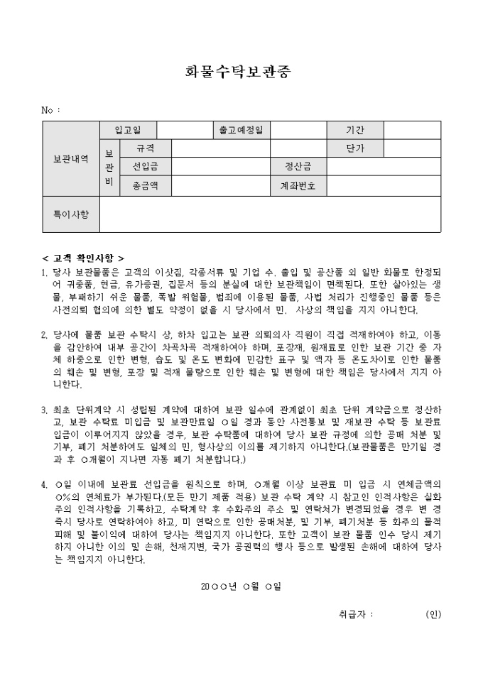 화물을 보관할때 보관내역과 특이사항을 항목에 맞게 기입하고 고객의 확인사항을 알리는 화물수탁보관증서식입니다.