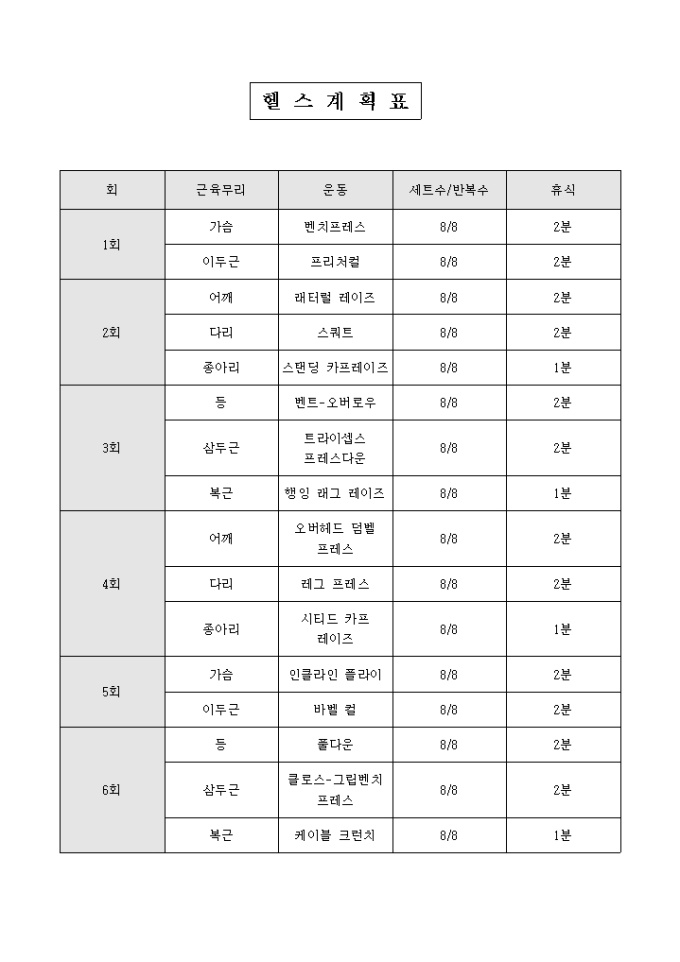 9,000원/월횟수별로 근육무리, 운동, 세트수/반복수, 휴식 항목에 맞게 헬스계획을 세우는 서식입니다.