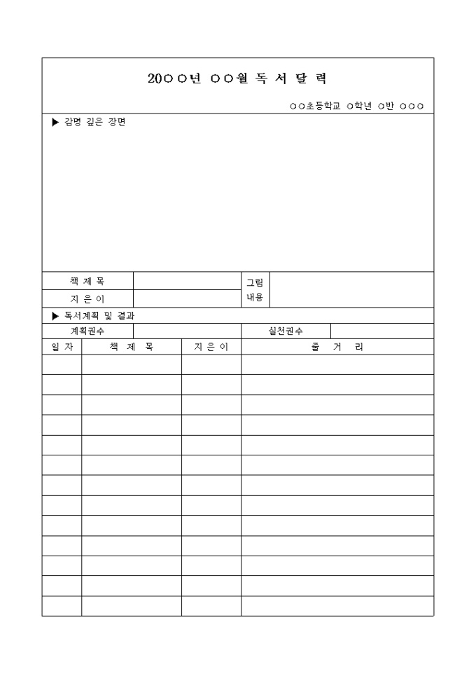 월별 작성할 수 있는 독서달력으로 책제목, 지은이, 줄거리를 작성하도록 되어있습니다.