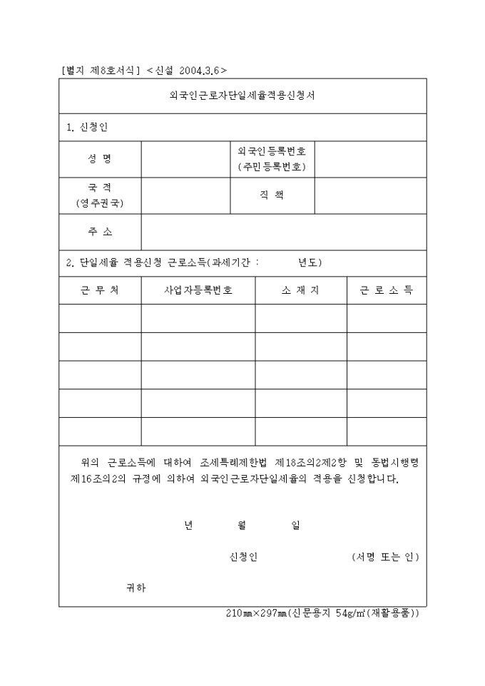 9,000원/월[2008년 연말정산]외국인근로자 단일세율 적용신청서입니다.