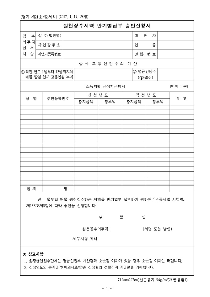 9,000원/월[2008년 연말정산]원천징수세액 반기별 납부승인 신청서입니다.