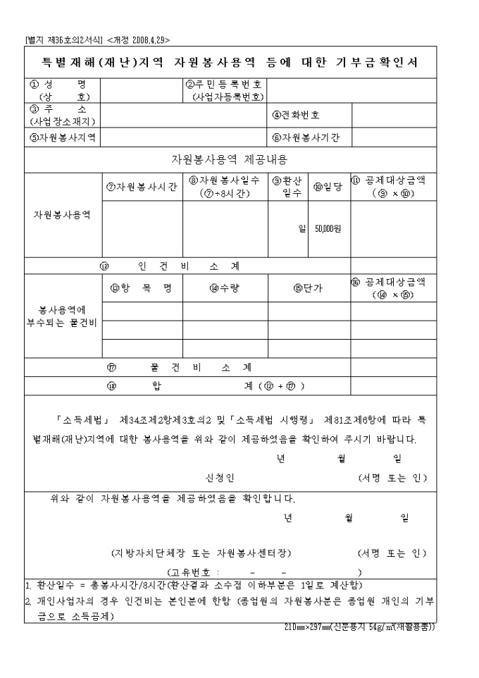 [2008년 연말정산]특별재해(재난)지역 자원봉사용역 기부금 확인서