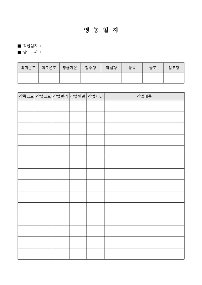 9,000원/월일일 작업한 내용을 작성하는 영농일지로 작목코드, 작업코드, 작업면적, 작업내용 등의 항목으로 구성되어 있습니다.