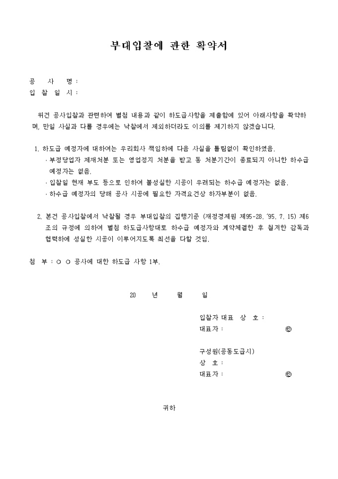 공사입찰과 관련하여 별첨 내용과 같이 하도급사항을 제출함에 있어 아래사항을 확약하며, 만일 사실과 다를 경우에는 낙찰에서 제외하더라도 이의를 제기하지 않겠다는 부대입찰에 관한 확약서 예제입니다.
