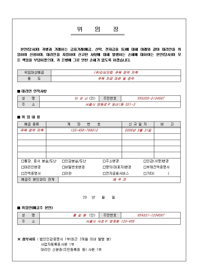 9,000원/월은행과 거래하는 금융거래에 대해 대리인을 위임하여 신청한다는 내용의 표준 금융 위임장입니다. 대리인, 위임인의 인적사항, 위임내용 등의 항목으로 구성되어있습니다.