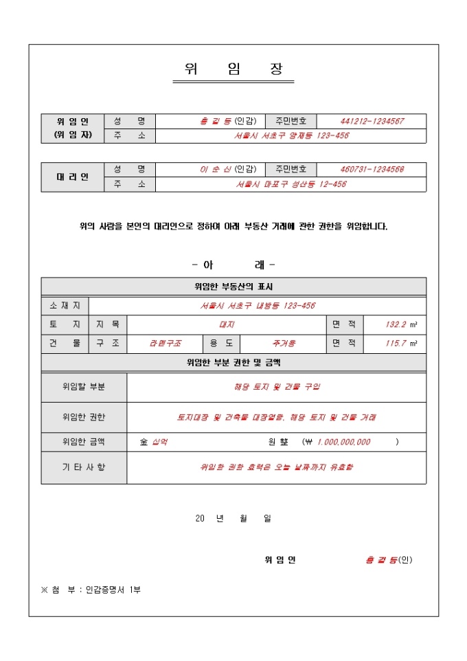 위임인, 대리인의 인적사항, 부동산의 표시 등의 항목으로 구성되어있습니다.