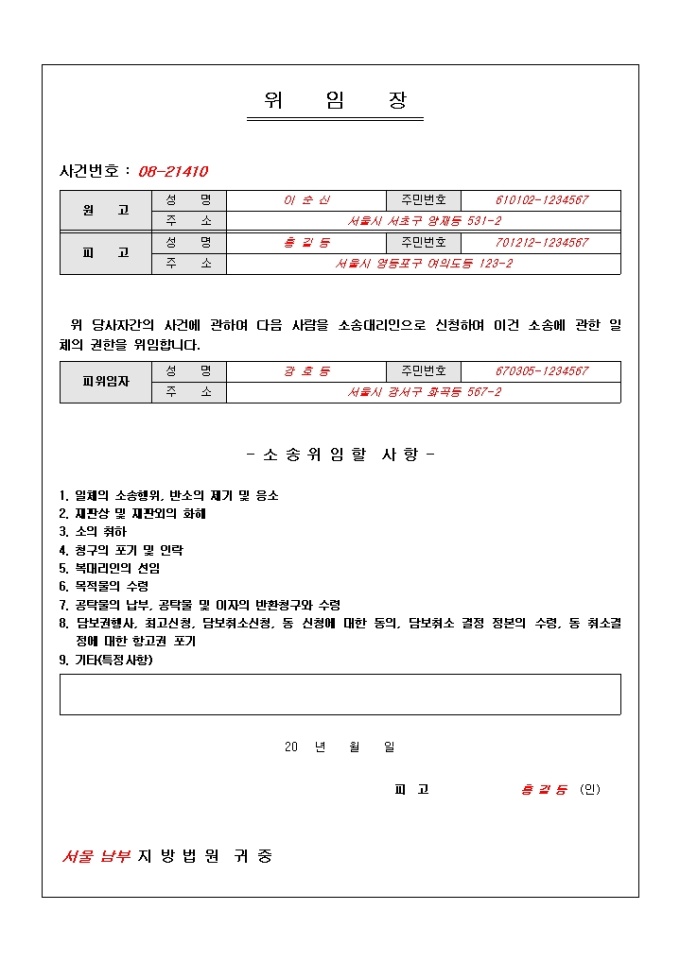 사건번호, 원고.피고의 인적사항, 피위임자, 위임내용 등의 항목으로 구성되어있습니다.